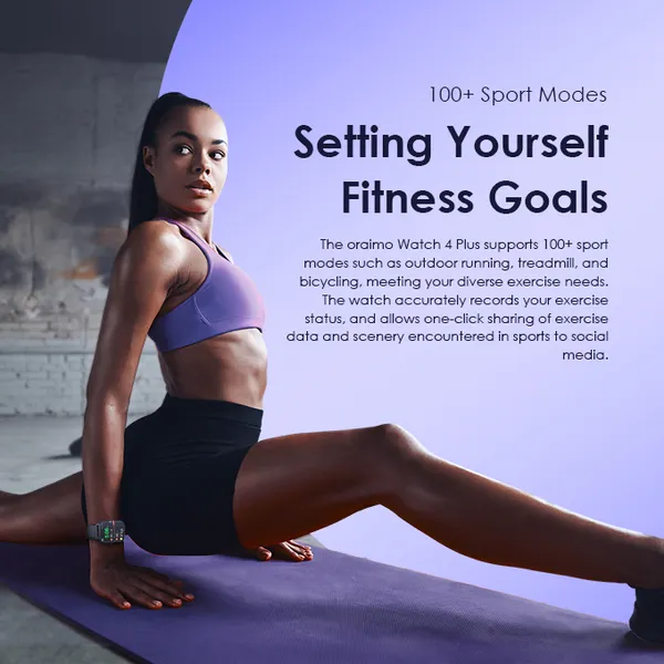 The oraimo Watch 4 Plus supports 100+ sport modes such as outdoor running, treadmill, and bicycling, meeting your diverse exercise needs. The watch accurately records your exercise status, and allows one-click sharing of exercise data and scenery encountered in sports to social media.